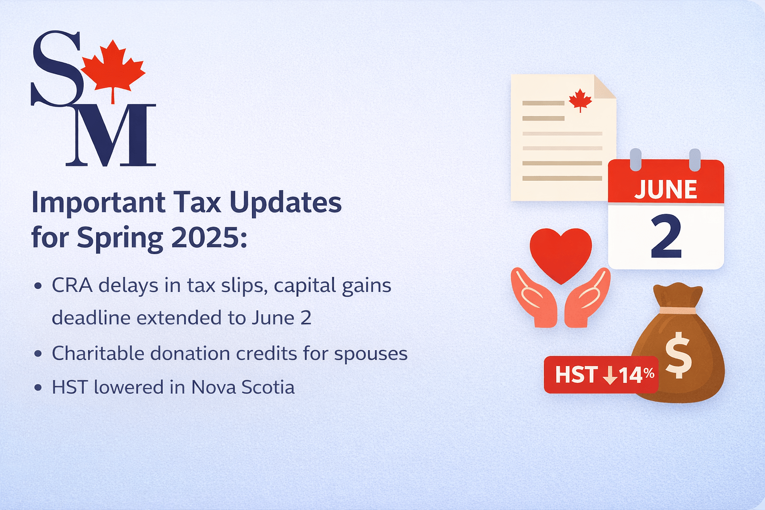 Canada Revenue Agency updates for spring 2025 include several important points for taxpayers. Due to delays in CRA posting certain tax slips online, some individuals may need to adjust already filed personal tax returns to report missing income. Individuals reporting capital gains have until June 2, 2025, to file and pay without penalties or interest. Taxpayers may also claim charitable donation tax credits for a spouse or common-law partner’s donations made within the past five years, even if the donation was made before the relationship began. In addition, a parking space can qualify as part of a condominium unit for principal residence exemption purposes, even if purchased separately. Finally, businesses should note that Nova Scotia’s HST rate was reduced to 14 percent effective April 1, 2025, and systems should be updated accordingly.
